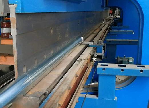 5、该机设有高精度工作台挠度补偿机构,以补偿工作时产生的挠度,确保工件每一点的折弯角度精度。工作台设计为外包结构,大大增加了两侧翅膀的强度。