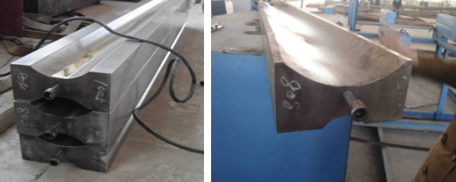 应用:用于小头直径小60mm圆锥路灯杆,斜率为11/1000和12.5/1000, 总长度为16米包括2套不同斜率的上模具,一套双面双斜率下模。