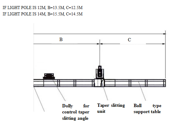 由趟排上的小车控制板料的斜度,进行滚剪,获得一头大,一头小的路灯杆钢板